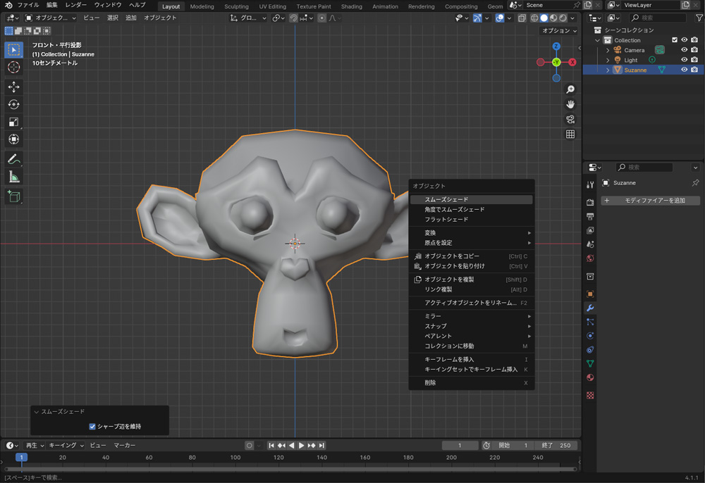 スムーズシェードは、オブジェクトの表面を滑らかにする機能です。フラットシェードは各面を平坦にし、面の境界線をはっきりと見せます。オブジェクトをスムーズシェードにしたい場合は、オブジェクトを選択して、右クリックで「スムーズシェード」を選択します。