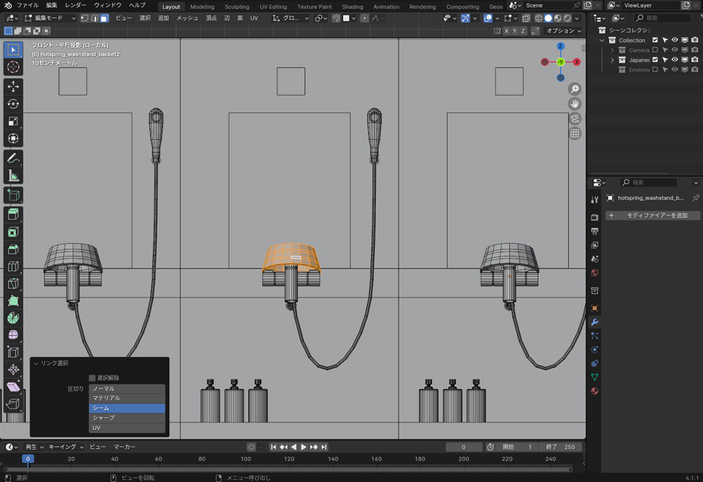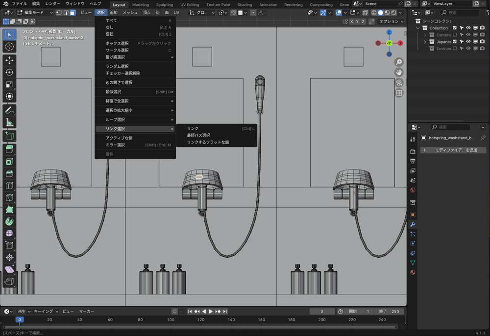 リンク選択は、メッシュの一部分を選択して、そのメッシュに接続された関連部分を選択する機能です。リンク選択をするには、編集モードに切り替えて、メッシュを選択し、Lを押します。