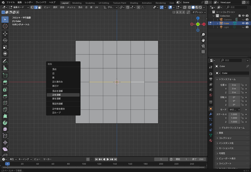 メッシュ(頂点、辺、面)は、Xで削除できますが、削除するとそのメッシュに接している辺や面も削除されます。溶解は、選択したメッシュのみを削除できます。溶解するには、Xで「頂点を溶解」を選択します。辺や面を溶解する場合は、それぞれ「辺を溶解」や「面を溶解」を選択します。