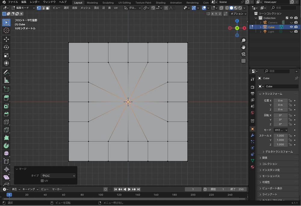 モデリングは、頂点を調整して立体的な形状を作成する作業です。頂点を調整していると、不要な頂点を結合したいことがあります。頂点をマージ(結合)するには、マージしたい頂点を選択してMを押します。「中心に」を選択すると、選択した頂点が中央で一つに結合されます。