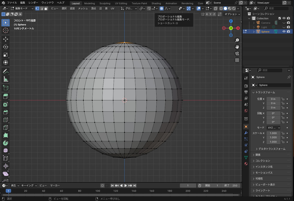 プロポーショナル編集は、選択したメッシュを編集するさいに、その周囲のメッシュも滑らかに変形させる機能です。プロポーショナル編集を有効にするには、3Dビューヘッダの「プロモーショナル編集」アイコンをクリックします。影響範囲を調整するには、マウスホイールを回します。プロポーショナル編集は、地形や有機的なオブジェクトのモデリングに役に立ちます。