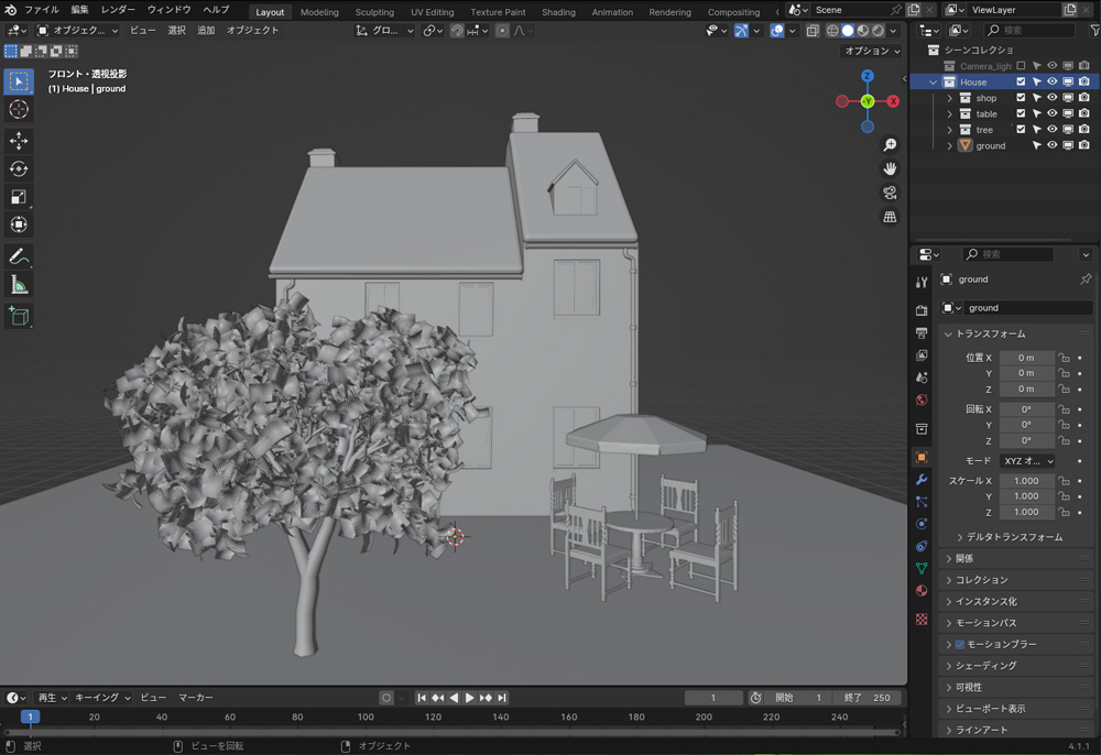 リアルタイムシャドウを試すために、Blenderで3DCGモデルを制作します。3DCGモデルは、リアルタイムシャドウの結果がわかりやすいように、テクスチャを設定せずマテリアルのみを設定しました。
